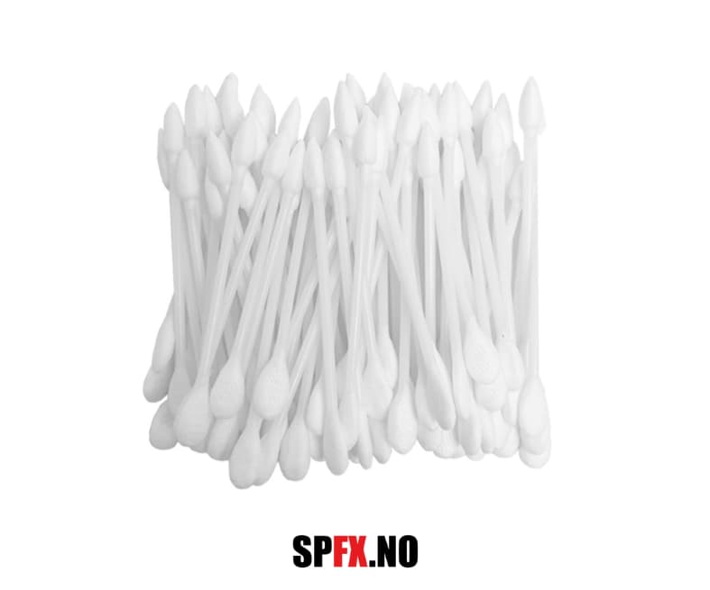 Proffe plastfrie kostmetiske bommulspinner/vattpinner laget av 100% ren bomull. Egnet til makeup, SFX-sminke og teatersminke. En ende er spiss egnet til korrigering av detaljer, og den andre er flat og rund egnet til påføring av ulike produkter på huden. Utmerket til påføring av kunstig blod.