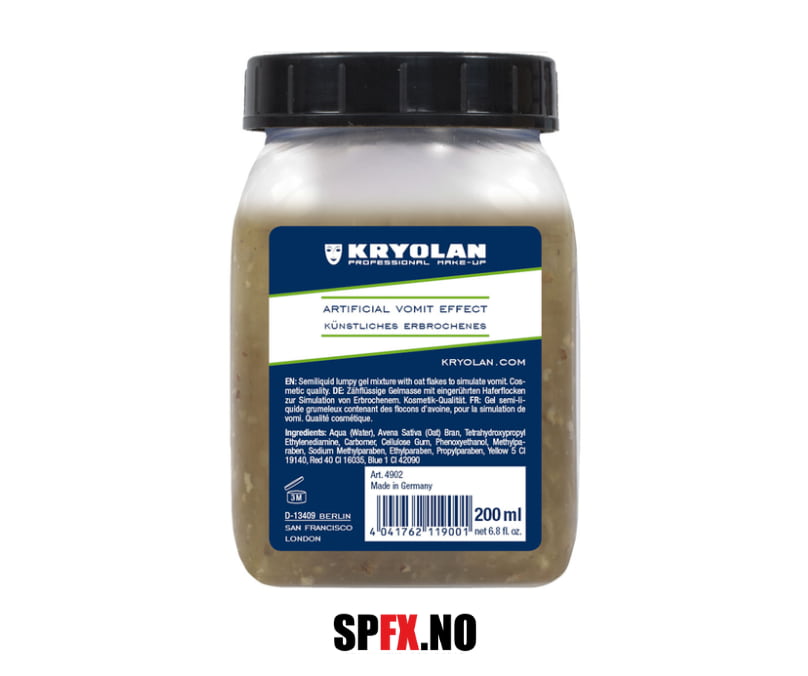 Kryolan Artificial Vomit Effect er et gelélignende effektstoff som er utviklet for å etterligne oppkast, og gelen inneholder små biter i hygienisk kosmetisk kvalitet. Bruk dette produktet til å lage motbydelige effekter for zombie-looken din, eller til film- og teaterproduksjoner, eller øvelser for å gjenskape effektene av kvalme eller oppkast. Helt motbydelig, ja, men samtidig en utrolig kul effekt.